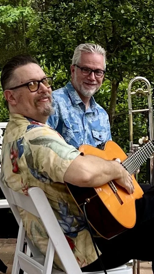 Trombone and guitar playing some swinging tunes. This size ensemble is usually asked for by restaurants, weddings, and other “background” music venues where people want to socialize while the music is playing. We can perform surprisingly quite as I specialize in using a wide variety of mutes so as to bring different timbres of sound for different styles of songs.